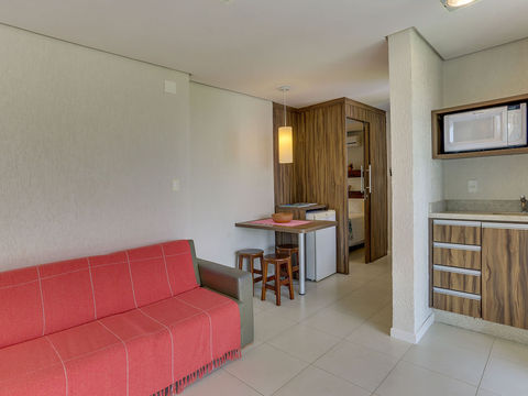 Ar-condicionado split, armários de cozinha, cadeiras, cama box de casal, chuveiro, cofre, frigobar, guarda-roupas, mesa de jantar, mesa de apoio para computador, micro-ondas, móveis na área externa, pia de cozinha, roupa de cama, secador de cabelo, sofá-cama, telefone, toalhas, travesseiros, TV de plasma 26" no quarto e 32" na sala, utensílios de cozinha.