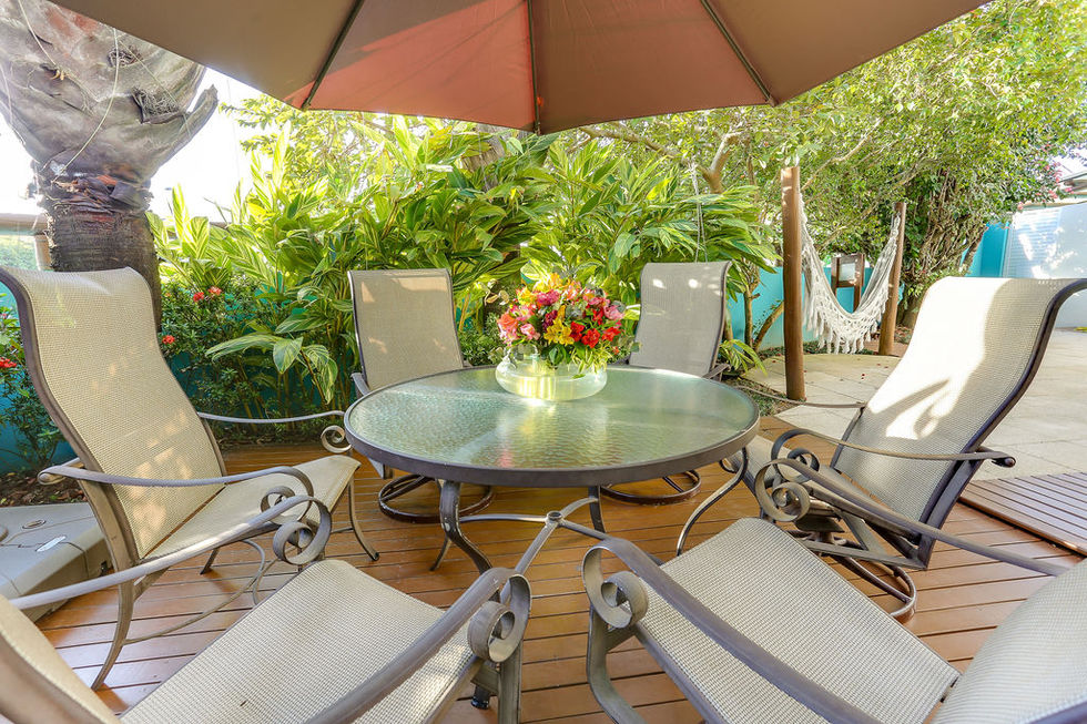 Do lado de fora, um jardim arborizado com espreguiçadeiras, mesas, cadeiras e Jacuzzi aquecida com hidromassagem. No outro lado da rua uma piscina com solário te espera.