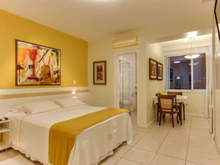 Os apartamentos são confortáveis, com a delicadeza dos lençóis de algodão egípcio, um luxo para acomodar duas ou três pessoas, equipados com ar condicionado, frigobar, TV tela plana, e suítes com hidromassagem.